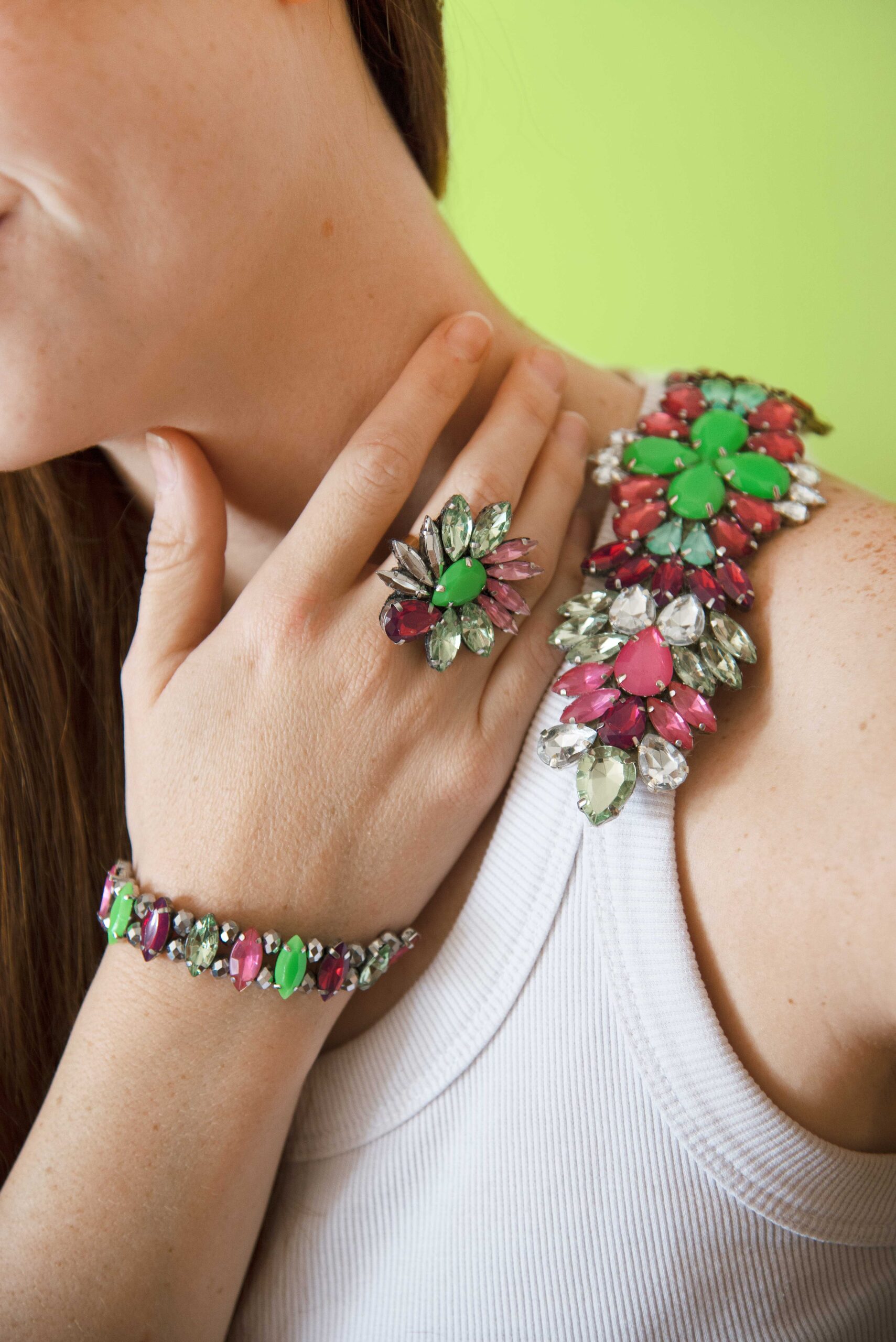 Anillo regulable con gemas en la gama verdes y uva.