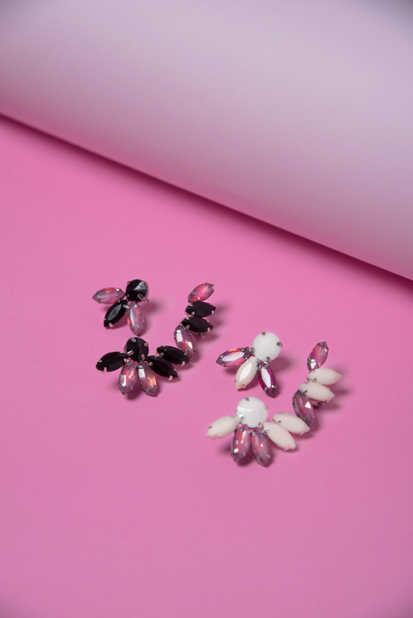 Par de aros “trepador” del lado izquierdo abarca todo el contorno de la oreja y para la derecha un detalle de gemas de la misma gama de color.