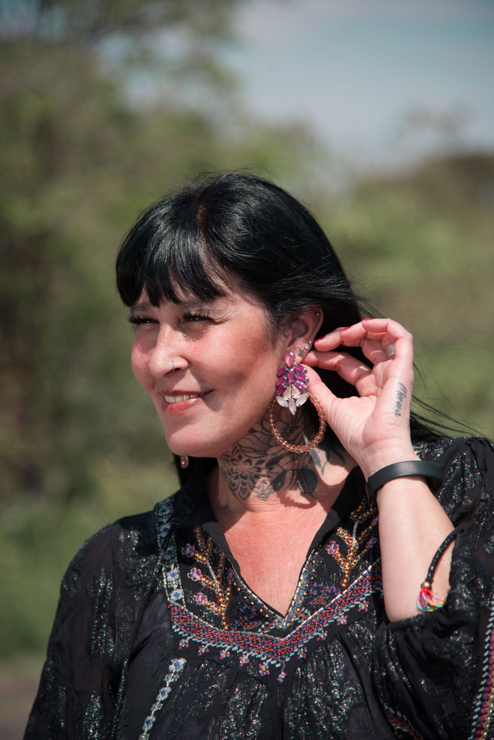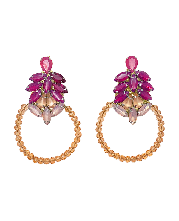 Visto Aros con gemas en color gama rosas, champagne y uva mas cristales de vidrio a tono. Gancho de aro pasante. Largo del aro: 9 cm. Ancho (la parte mas ancha) 5 cm.