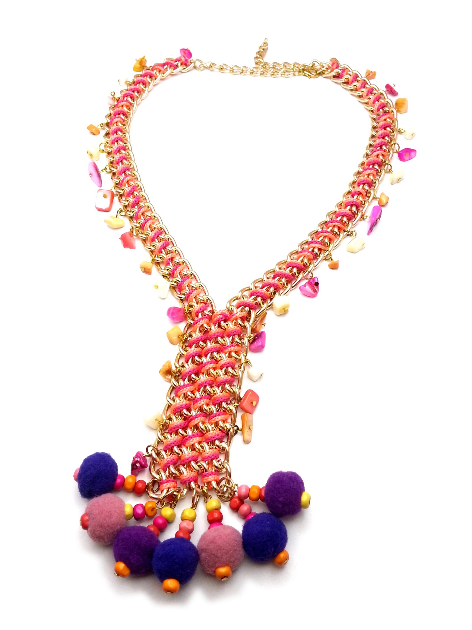 Collar de cadena dorada rosada, unidas con cordones y decorada con piedras y pompones. Un modelo super boho-chic1