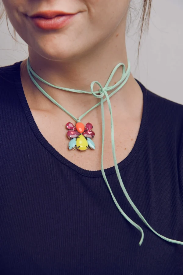 LAZO DE GAMUZA CON GEMAS DE COLORES.