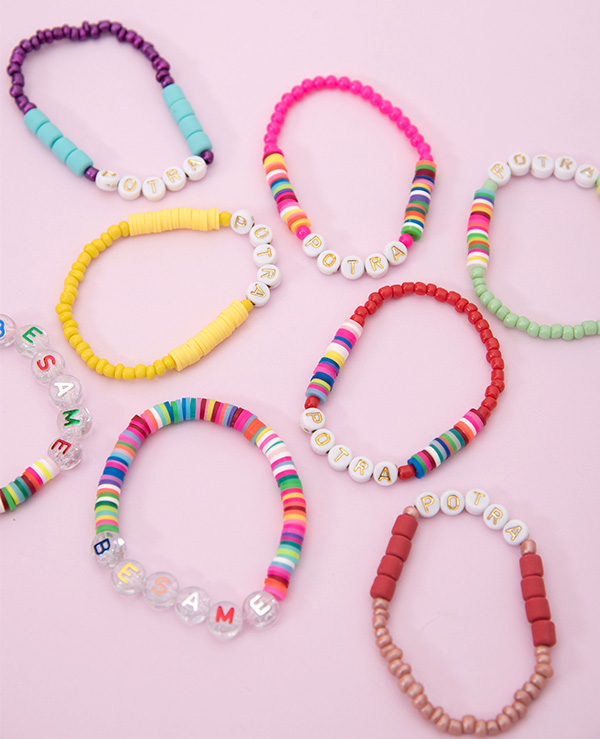 Pulsera elástica de mostacillas, fimos y letras con la palabra POTRA.